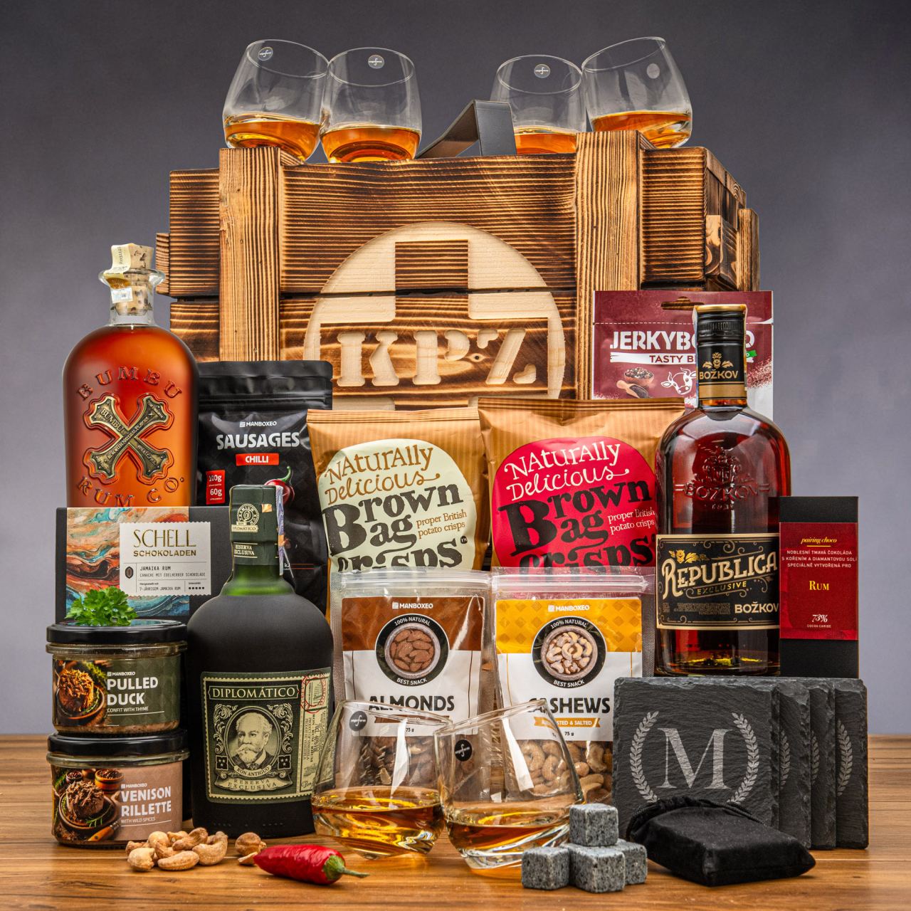 So eine Plackerei kann einen ganz schön fordern. Zum Glück bringt der luxuriöse Inhalt unseres Notfall-Kits die nötige Portion Trost. Neben hochwertigem Rum findest du darin clevere Extras, die jeden Schluck noch ein bisschen besser machen. Dazu kommen süße und salzige Snacks, die die Aromen des Rums perfekt unterstreichen. Und wie rundet man das Ganze ab? Mit guter Gesellschaft!