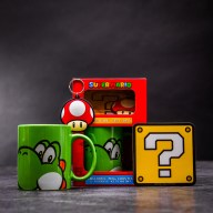 Becher-, Untertasse- und Schlüsselbund-Set mit Yoshi – machen Sie sich bereit für neue Abenteuer! Lustiger Dinosaurier Yoshi gedruckt auf einem grünen Becher begleitet Sie durch jedes Level, das Sie tagsüber erwartet. Im Geschenkset finden Sie eine Untertasse mit einem Box-Motiv mit Fragezeichen und einen Schlüsselbund mit einem grünen Schwamm. Alle Produkte sind offiziell lizenziert.