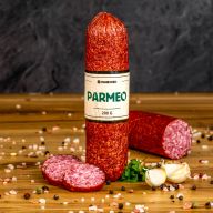 Salami Parmeo 200 g – Hervorragende Salami mit Zusatz von langgereiftem Käse, hergestellt in einem traditionellen Familienbetrieb. Der Parmesan verleiht der Salami ein charakteristisches Aroma und unverwechselbaren Geschmack.
