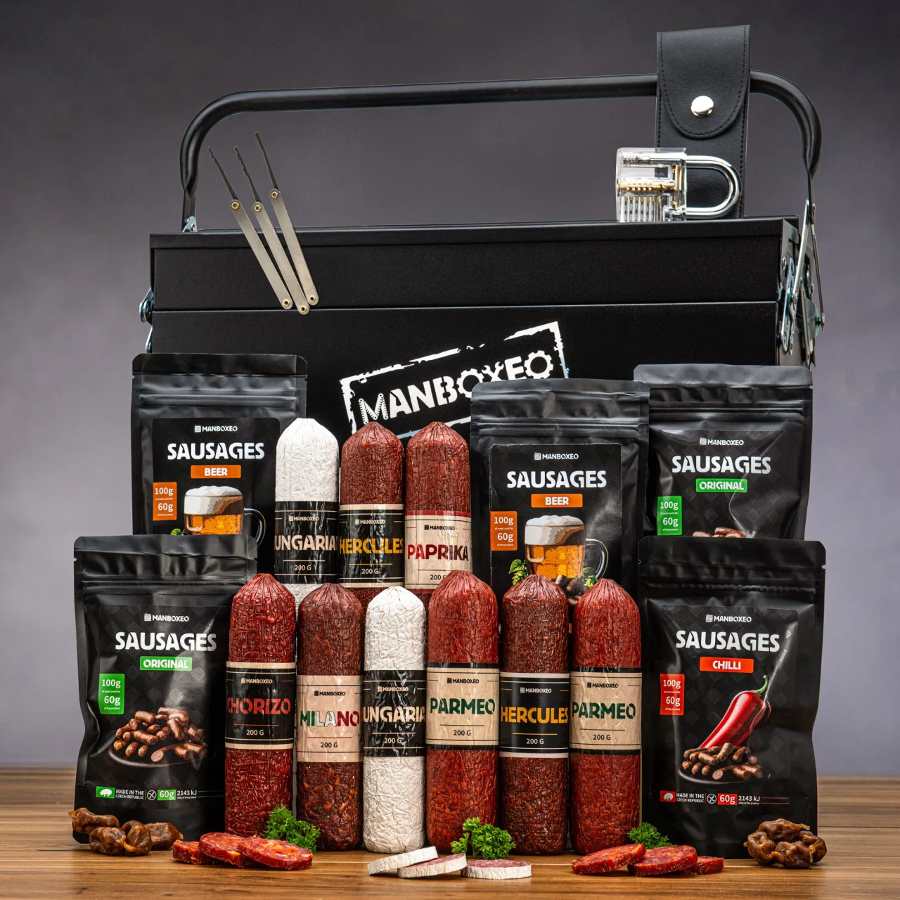 Sie dachten, in der Metalldose versteckt sich nur Werkzeug? Irrtum, meine Damen und Herren. Wer dieses Schmuckstück bekommt, erlebt eine echte Gourmet-Erfahrung. Das ist ein Geschenk, das jeder Fleischliebhaber lieben wird! Es erwartet Sie eine großzügige Auswahl – von ehrlichen Fleischsalamis nach Rezepten aus aller Welt bis hin zu aromatischen Trockenwürstchen, die schneller verschwinden, als Sie „Guten Appetit“ sagen können.