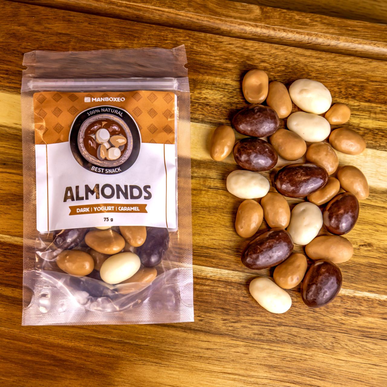 Schokomandeln Karamell & Zartbitter & Weiß (75 g) – Drei verführerische Schokoladensorten – dunkle, karamellige und weiße – umhüllen köstliche Mandeln. Eine unwiderstehliche Kombination, die zum Genießen einlädt.