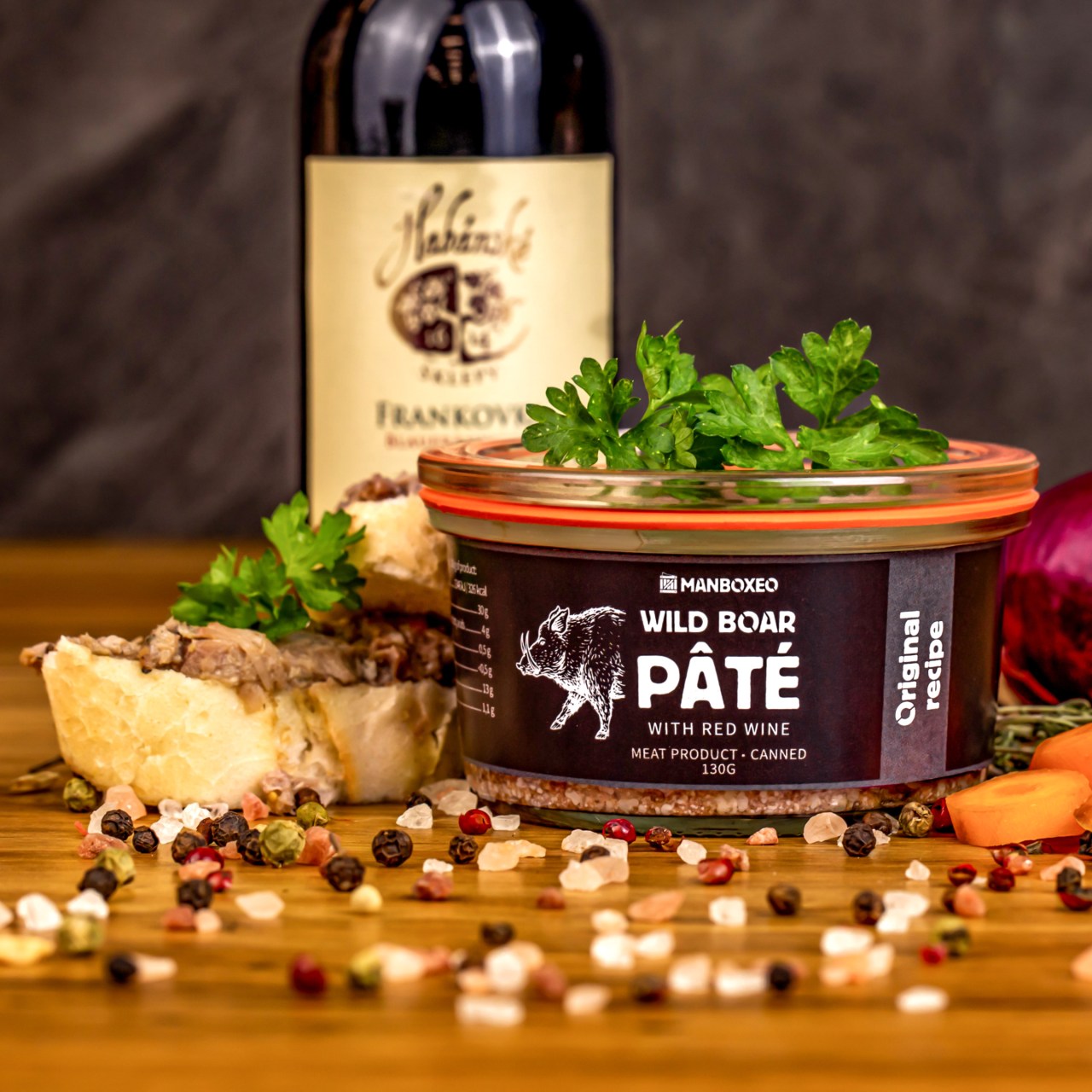 Wildschweinpastete mit Rotwein (130 g) – Eine delikate Wildpastete, verfeinert mit Wacholderbeeren und Wildgewürzen, liebevoll handwerklich zubereitet mit Rotwein. Leicht streichfähig und auch für Zöliakie-Betroffene geeignet.
