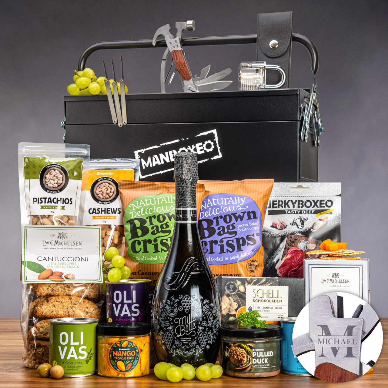 Dieser Koffer ist ein toller Geschenk für Vater, Ehemann oder Bruder. Er beeindruckt nicht nur mit liebevoll ausgewähltem Inhalt, sondern dient nach der kulinarischen Verführung praktisch als tragbare, abschließbare Werkzeugbox. Zweifel? Kein Grund! Besseres Geschenk finden Sie nicht.