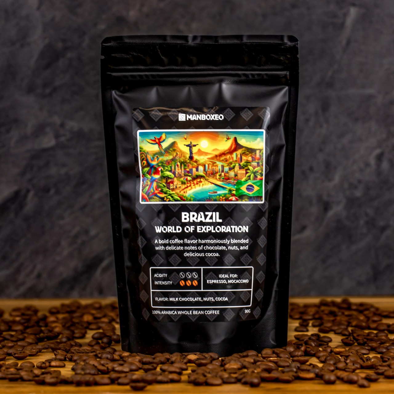 Brasilien (90 g) – 100 % ARABICA – Ganze Bohnen mit intensivem Schokoladengeschmack, ergänzt durch feine Noten von Nüssen und Kakao. Hohe Intensität, niedrige Säure. Ideal für Espresso und Mokka.