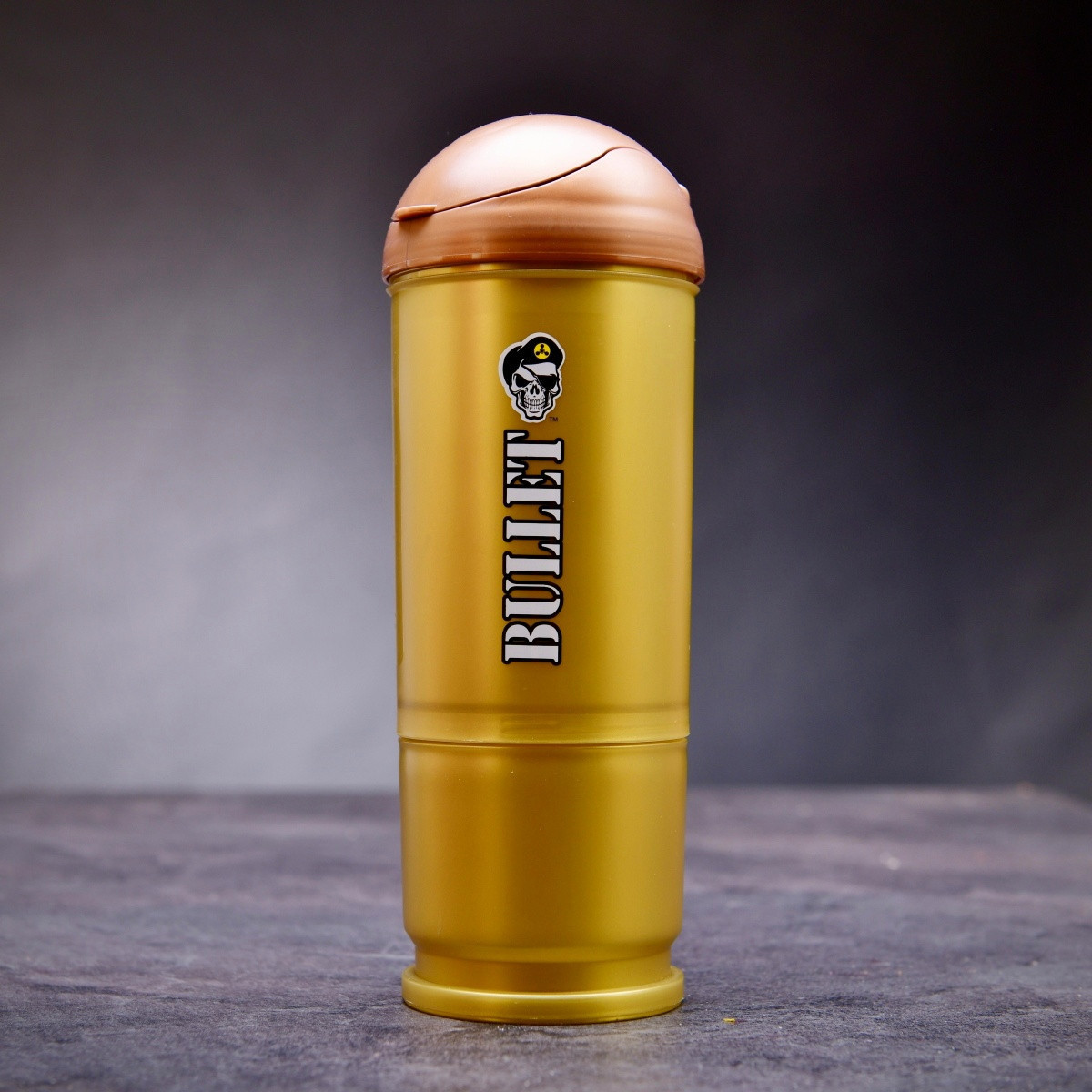 Stylischer Shaker in Patronenform 600 ml - Rüsten Sie sich für Ihr Training mit einem echten Hingucker aus! Dieser stylische Shaker in Form einer 9mm-Patrone – natürlich in Übergröße – motiviert Sie zu Höchstleistungen. Das patentierte Design mit Doppeldichtung sorgt für ein gründliches und schnelles Mischen aller Pulverergänzungen. Im unteren Teil befindet sich ein abschraubbares Fach für Supplemente oder kleine Gegenstände, die Sie immer bei sich haben möchten. Hergestellt aus hochwertigem Harz ohne BPA oder DEHP – für selbst das explosivste Workout gemacht.