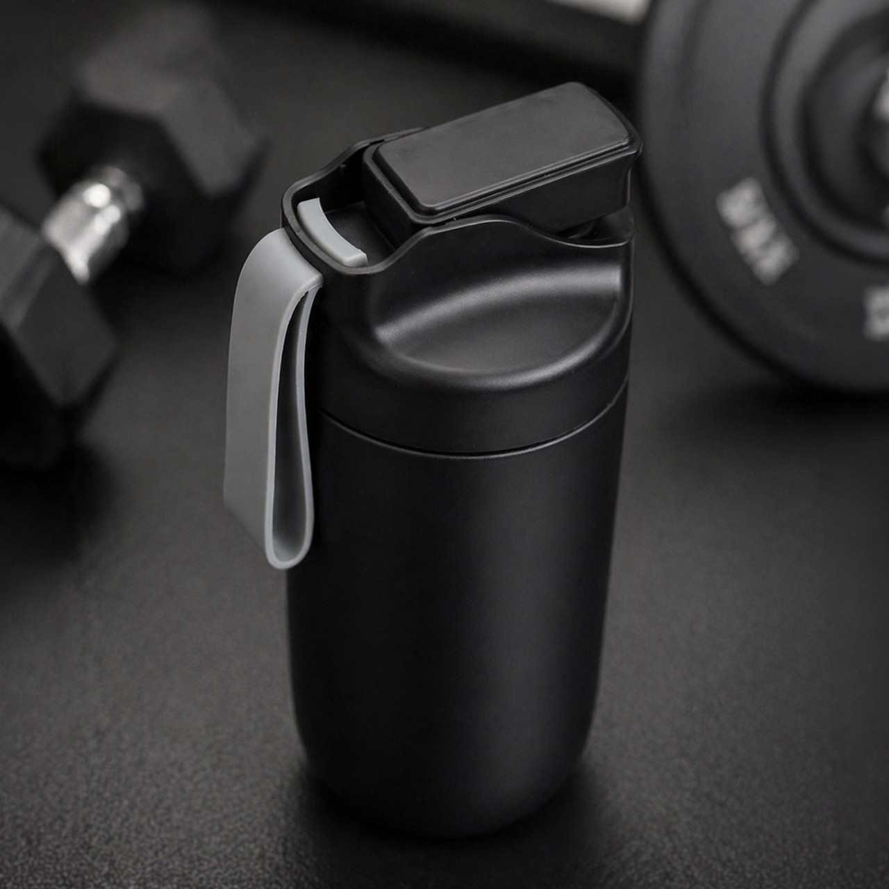 Schwarzer Fitness-Shaker aus Edelstahl – stilvoller Begleiter für ein aktives Leben