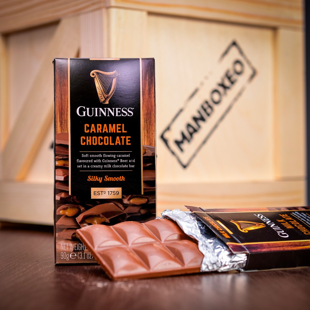 Guinness Vollmilchschokolade mit Karamell 90g – Hochwertige, zartschmelzende Vollmilchschokolade, gefüllt mit Karamell und leicht aromatisiert mit dem berühmten Guinness-Bier. Ein Muss für alle Bierfreunde.