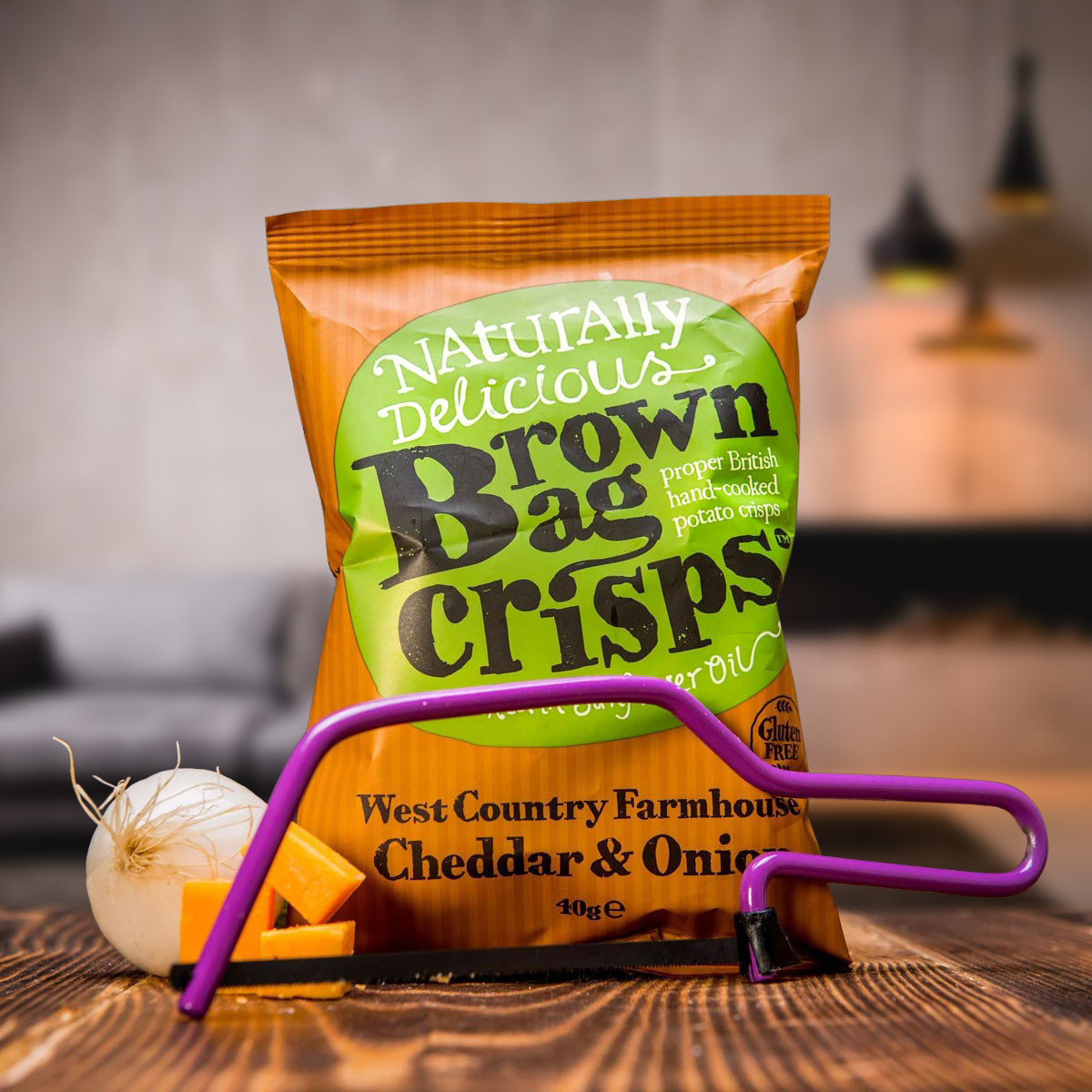 Knusprige, handgemachte Brown Bag Crisps mit Cheddar und Zwiebel 40 g
