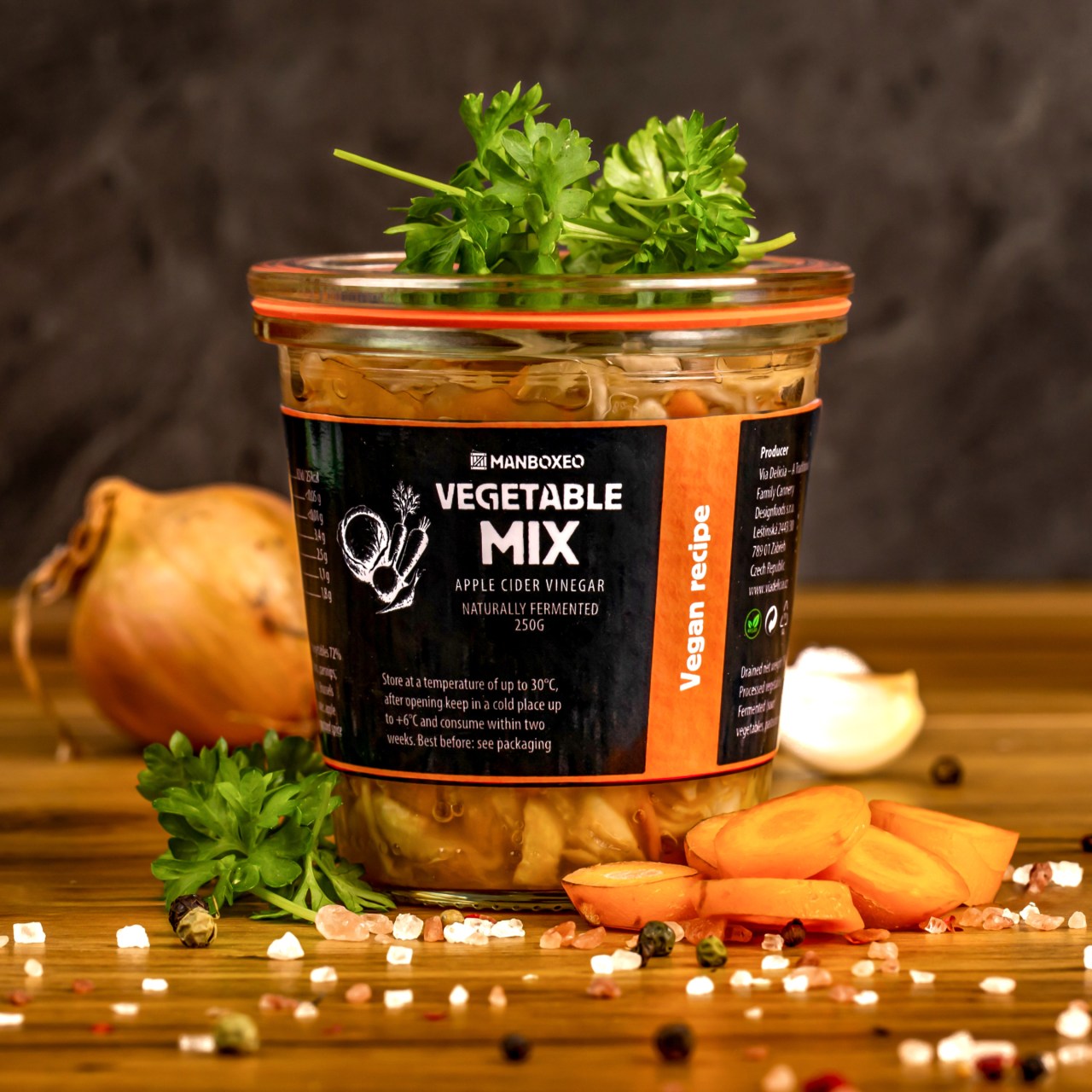 Fermentiertes Gemüse mit Apfelessig 250 g – Eine perfekte Kombination aus verschiedenen fermentierten Gemüsesorten, angenehm säuerlich im Geschmack und voller Vitamine. Genieße es pur mit Brot oder als Beilage zu anderen Gerichten.