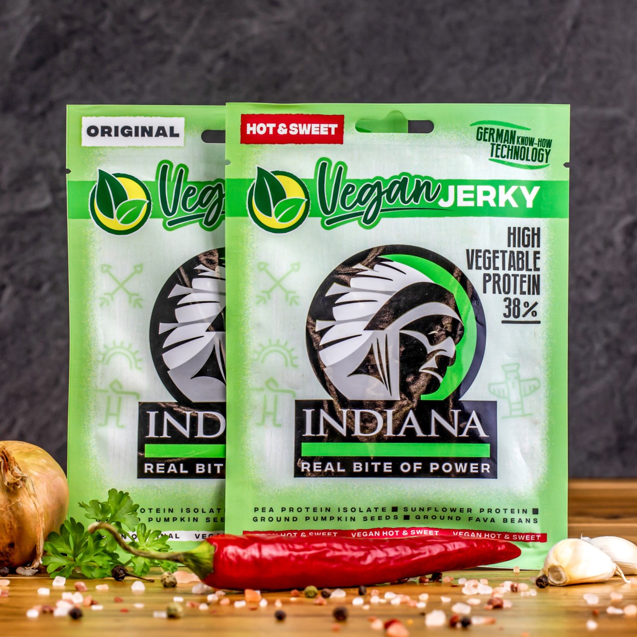 2x Vegan Jerky Hot&Sweet 25 g Indiana – Fleisch ist nicht dein Ding, aber eine Alternative zu Trockenfleisch wäre genau das Richtige? Probier unsere vegane Variante! Dank der praktischen Verpackung ist es der perfekte Snack für die Tasche.