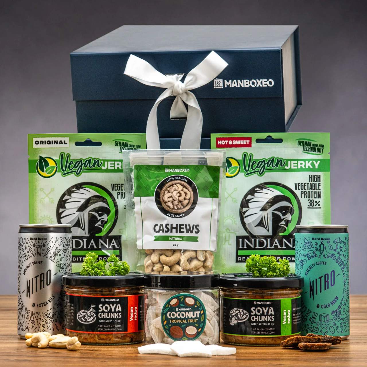 Was verbirgt diese unscheinbare Schachtel? Große Überraschungen! Der Beschenkte darf sich auf vegane Spezialitäten freuen, die all seine Sinne verzaubern. Leckere Snacks, Premium-Kaffee – und damit ist noch lange nicht Schluss. Das muss man einfach am eigenen Leib… oder besser mit allen Sinnen erleben!