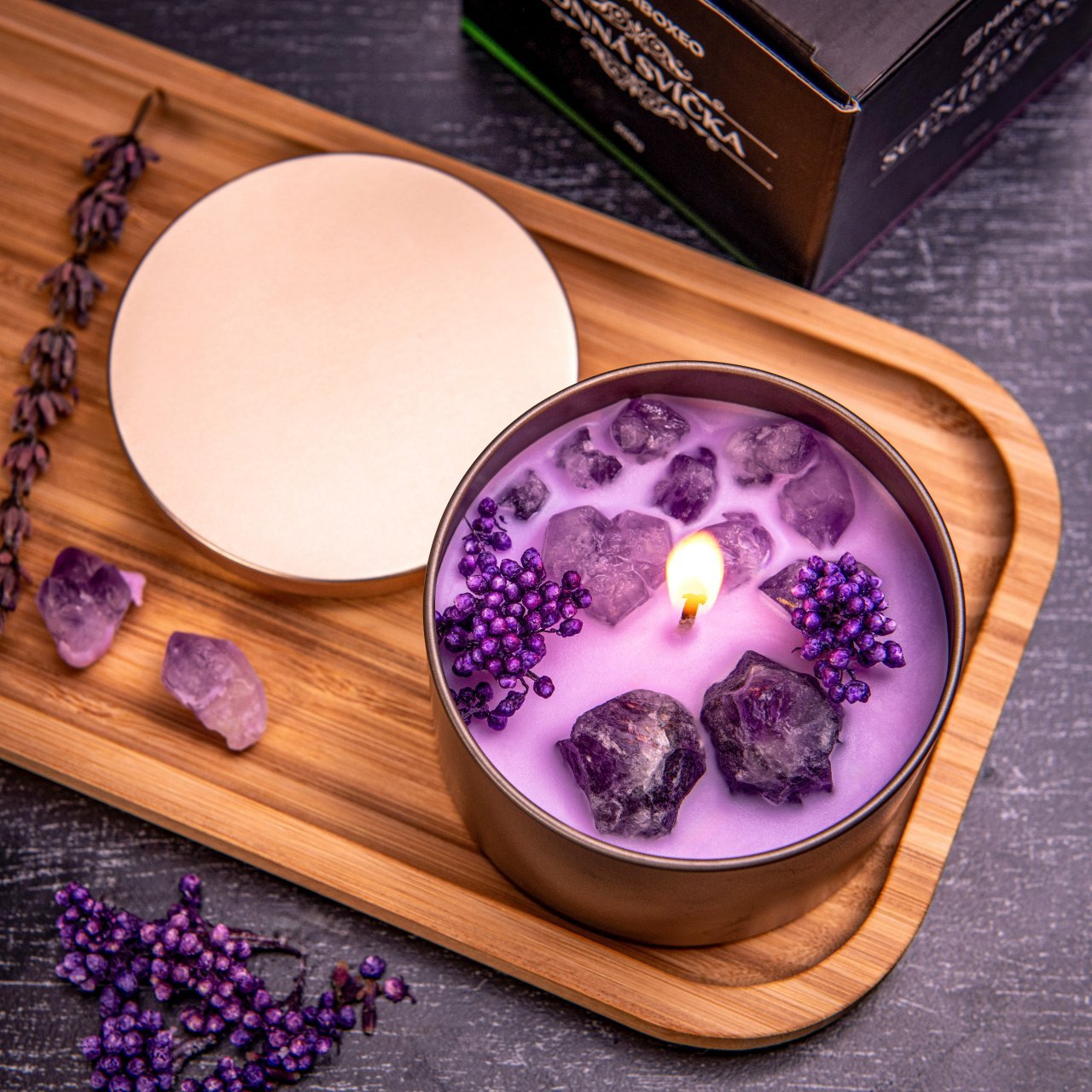 DUFTKERZE in Metalldose in Geschenkbox 200g – LAVENDEL – Diese 2-in-1-Kerze erfüllt Ihr Zuhause mit warmem Licht und göttischem Lavendelduft und ist gleichzeitig ein schöner Blickfang – mit lila Steinchen, die beim Brennen herrlich funkeln.