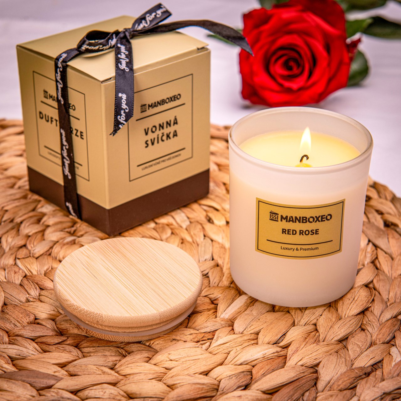 Cremefarbene DUFTKERZE in Geschenkschachtel mit Schleife – ROTE ROSE – Stellen Sie sich den Duft roter Rosen vor – genau so riecht diese wunderbare Kerze, die dank ihres minimalistischen Designs überall gut aussieht: zu Hause, im Büro oder im Massagestudio.