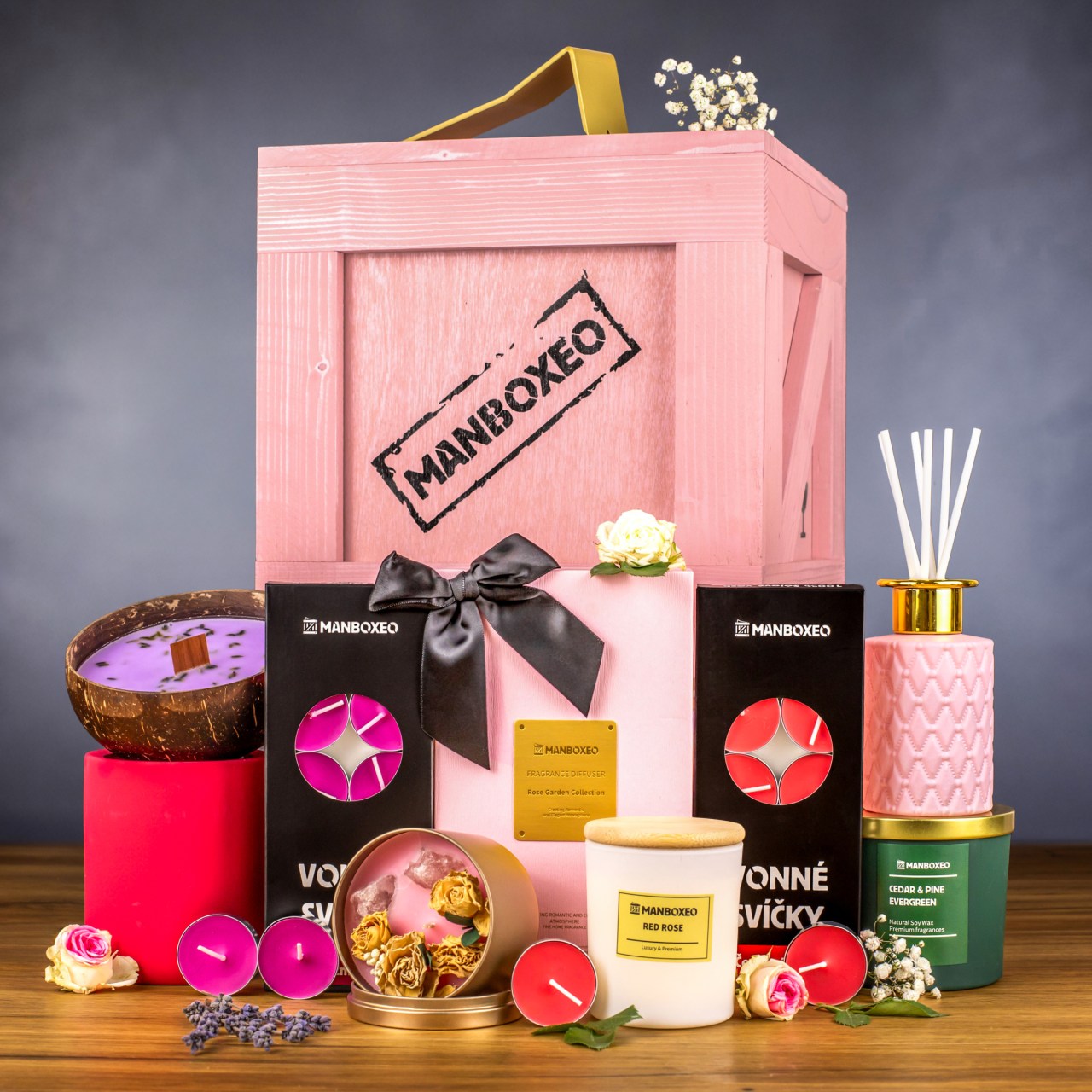 Ist die Beschenkte eine Liebhaberin blumiger Düfte? Dann stellen Sie sich lieber hinter sie, wenn sie die Truhe öffnet – für den Fall, dass ihr vor Freude die Knie weich werden! Im Inneren wartet nämlich eine geballte Ladung Kerzen und ein Aroma-Diffusor, deren Duft sie direkt in einen blühenden Blumengarten entführt. Das wird unvergesslich!