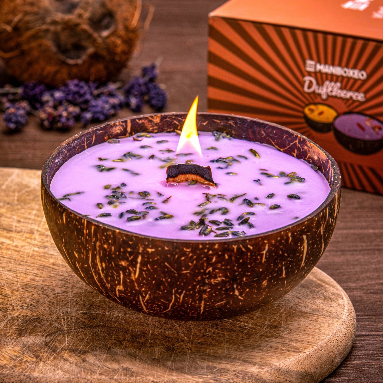 Kokos-DUFTKERZE – Lavendel – Nein, das ist kein Dessert – sondern eine natürliche, duftende, liebevoll gestaltete Kerze mit Lavendelduft und knisterndem Holzdocht, die eine friedliche Wohlfühlatmosphäre wie am Kamin schafft.