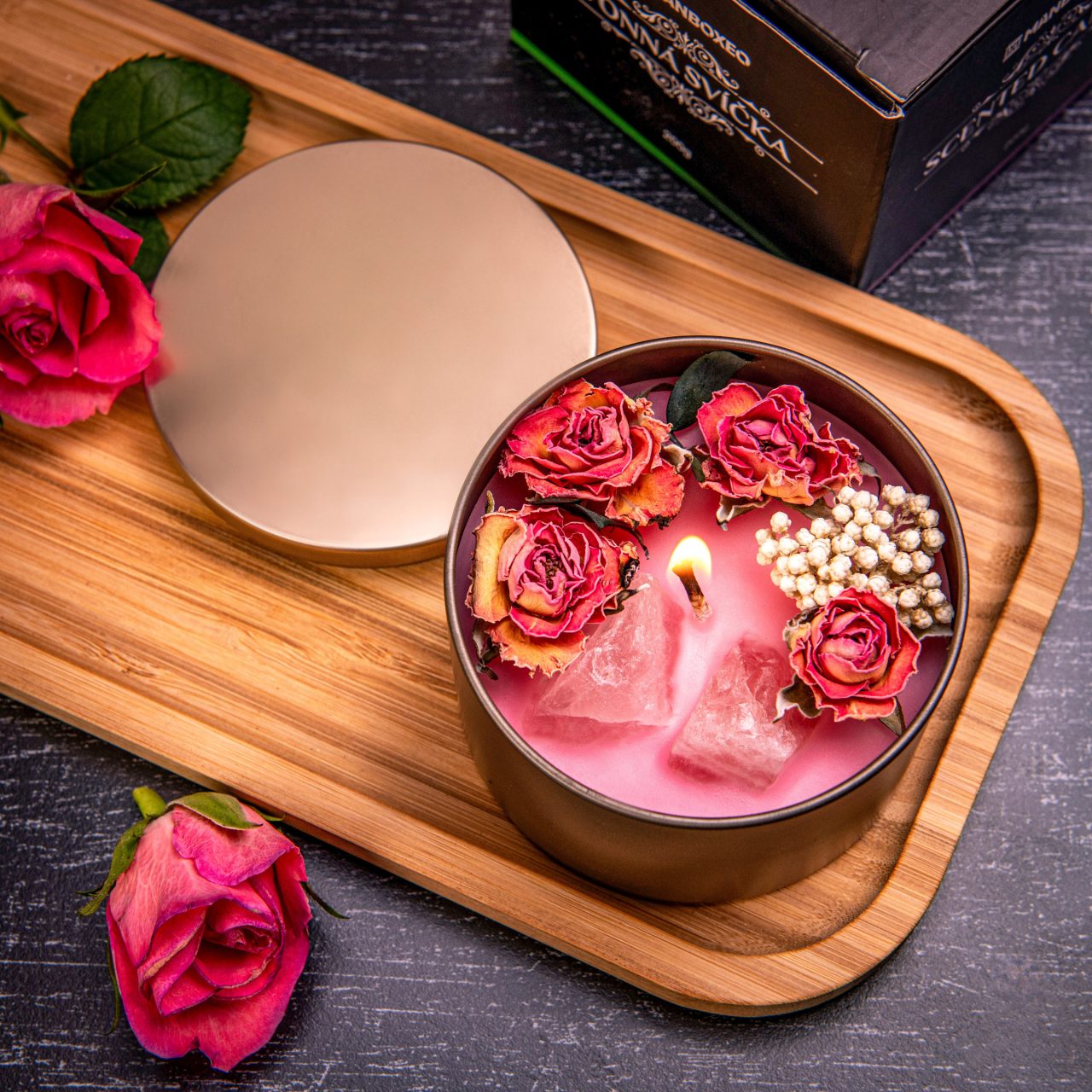 DUFTKERZE in Metalldose in Geschenkbox 200g – Rose – Diese Kerze mit himmlischem Rosenduft erfüllt Ihr Zuhause mit Wärme und Licht und ist mit getrockneten Blüten und kleinen Steinen verziert, die beim Brennen wunderschön glitzern.