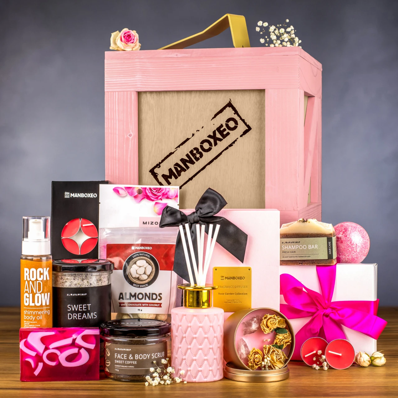 Hat es die Beschenkte hineingeschafft? Gratulation! Die Kiste ist bis zum Rand mit duftenden und essbaren Geschenken gefüllt. Die Flasche hochwertigen Proseccos haben wir mit luxurieller Kosmetik, Duftkerzen und einer süßen Überraschung ergänzt – zusammen sorgt to für ein perfektes Wellness-Erlebnis. Einfach Wellness, nur bequem von zu Hause. Und genau das wollt ihr. Ab jetzt stellt euch besser nicht zwischen die Frau und die Kiste – das könnte schmerzhaft enden!
