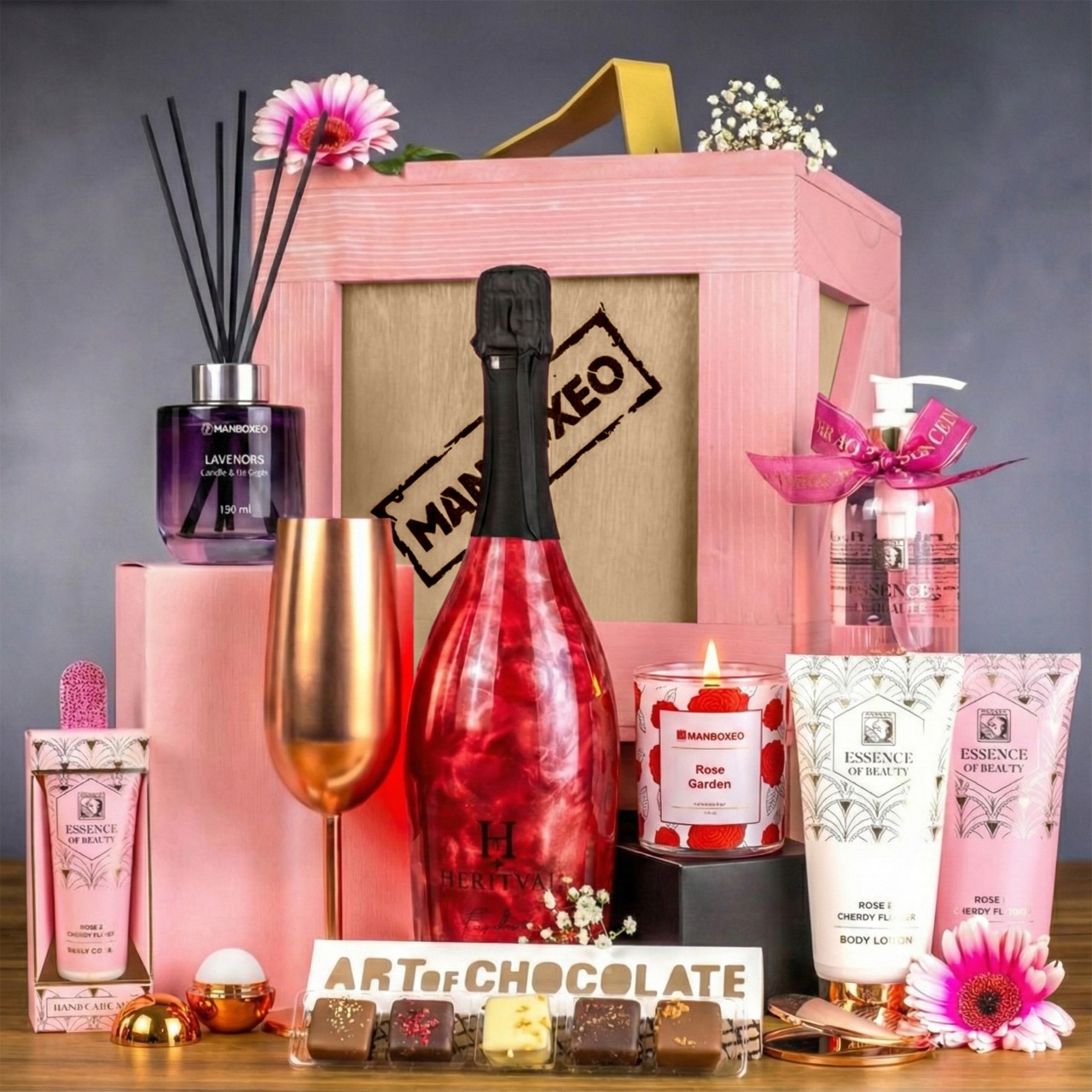 Kisten sind nicht nur für Männer! Diese rosa Schönheit wird jede Frau beeindrucken, der Sie sie schenken. Warum? Im Inneren wartet eine ganze Reihe von Produkten, die definitiv einen Versuch wert sind. Und es gibt viel auszuprobieren. Körperpflege, duftende Kerze, köstliche Pralinen und dazu hervorragender Wein. Pure Wonne!