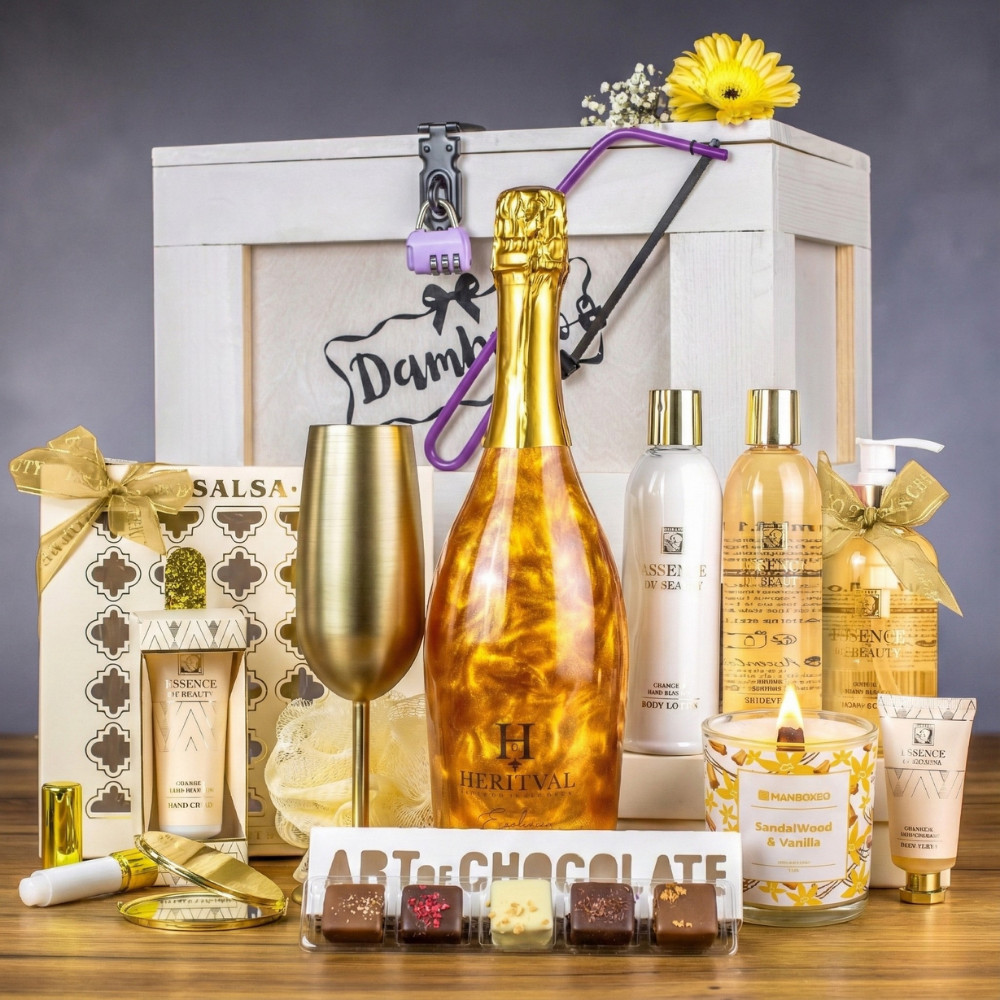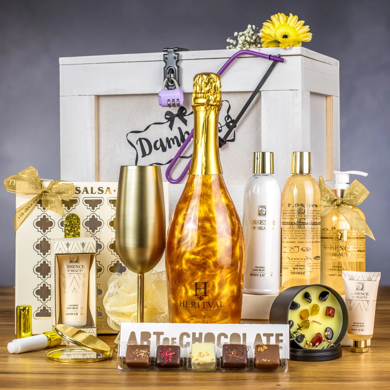 Was sollte man in einer Truhe für eine Göttin anderes erwarten als eine Fülle an Premium-Produkten? Sie sorgen nicht nur für eine angenehme Atmosphäre, sondern auch für Wohlbefinden des ganzen Körpers – außen wie innen. Ja, wir meinen damit auch ein Weinchen, das es sich lohnt zu probieren. Schenken Sie der Jubilarin Momente voller Ruhe und Entspannung, die sie sich verdient hat.