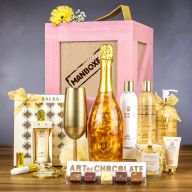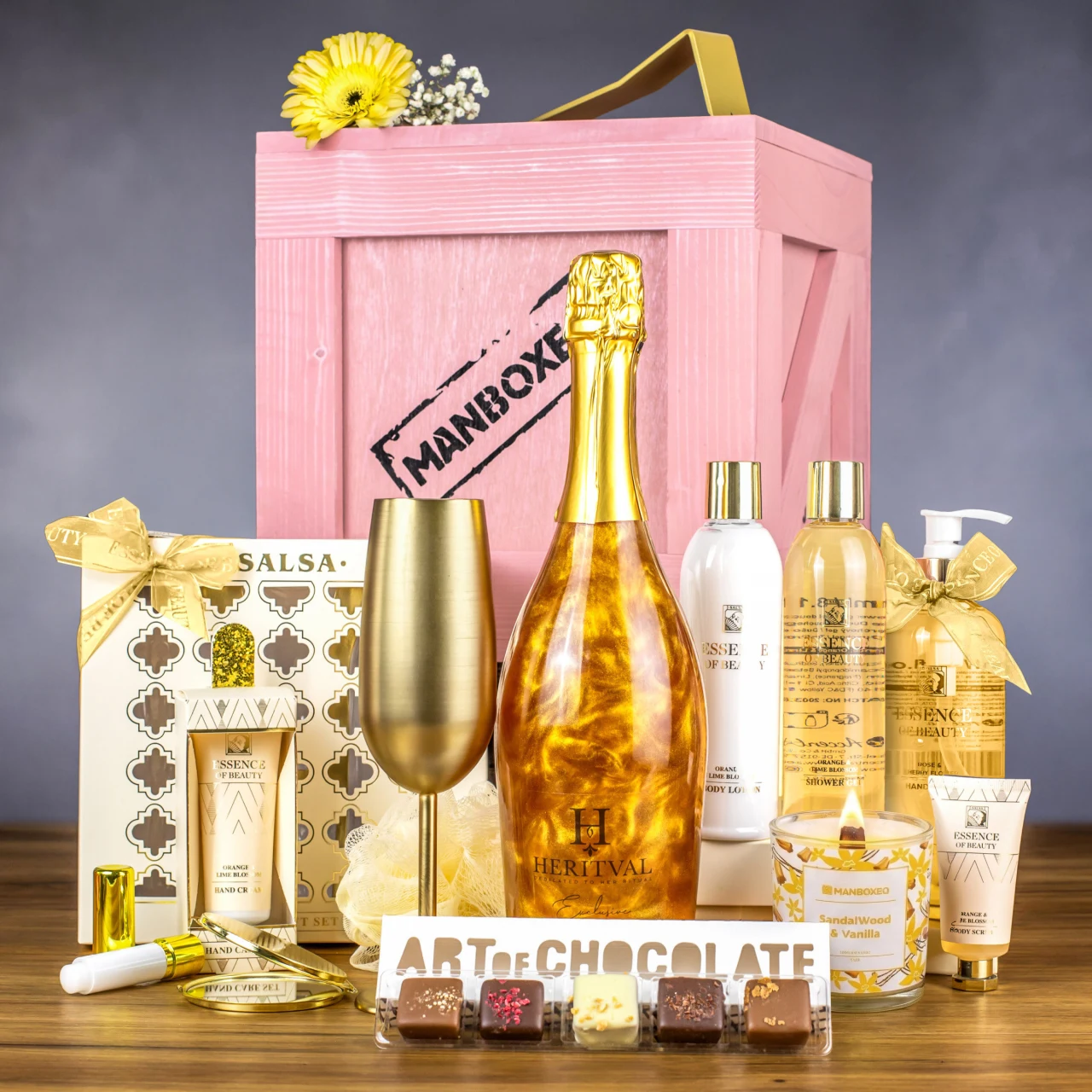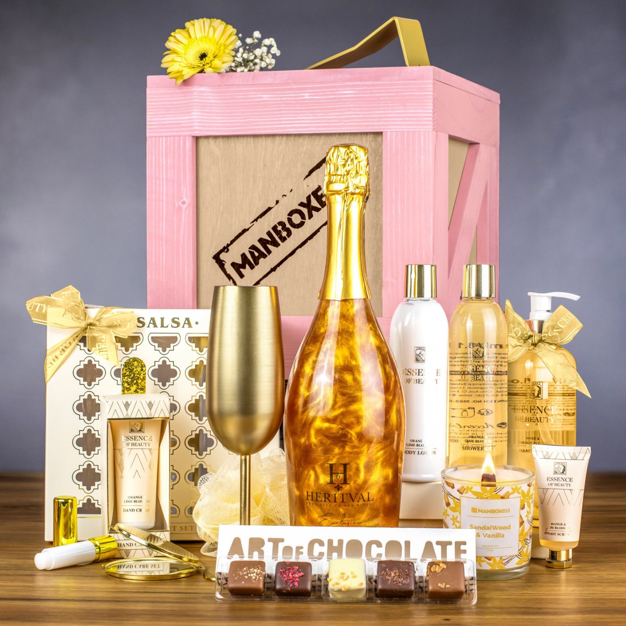 Kisten sind nicht nur für Männer! Diese rosa Schönheit wird jede Frau beeindrucken, der Sie sie schenken. Warum? Im Inneren wartet eine ganze Reihe von Produkten, die definitiv einen Versuch wert sind. Und es gibt viel auszuprobieren. Körperpflege, duftende Kerze, köstliche Pralinen und dazu hervorragender Wein. Pure Wonne!