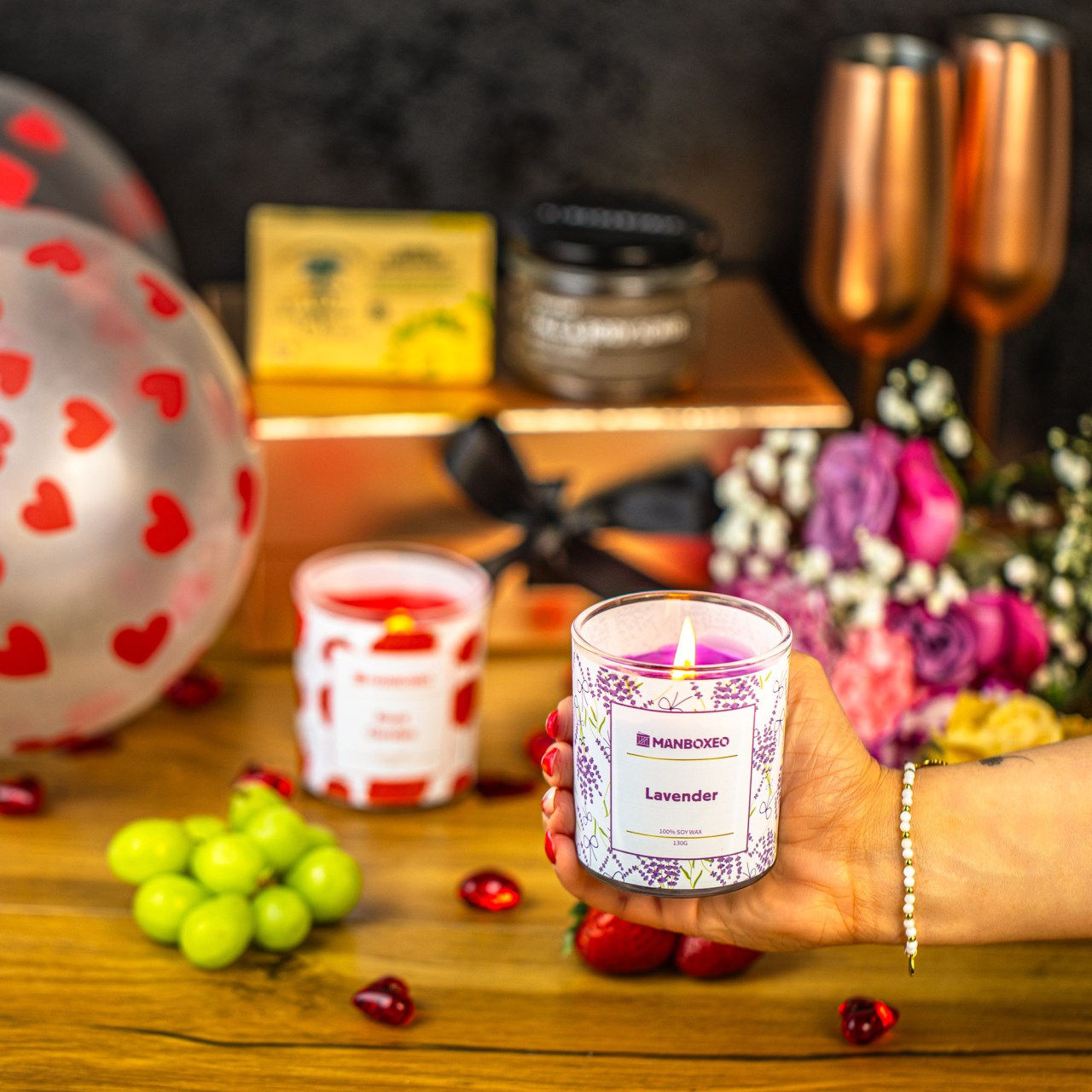 Licht, Duft und Stille. Rose, Lavendel, Kaffeepeeling und eine milde Seife für einen Abend, an dem der Kopf abschaltet und die Stimmung entfacht wird. Nicht mehr, nicht weniger.