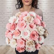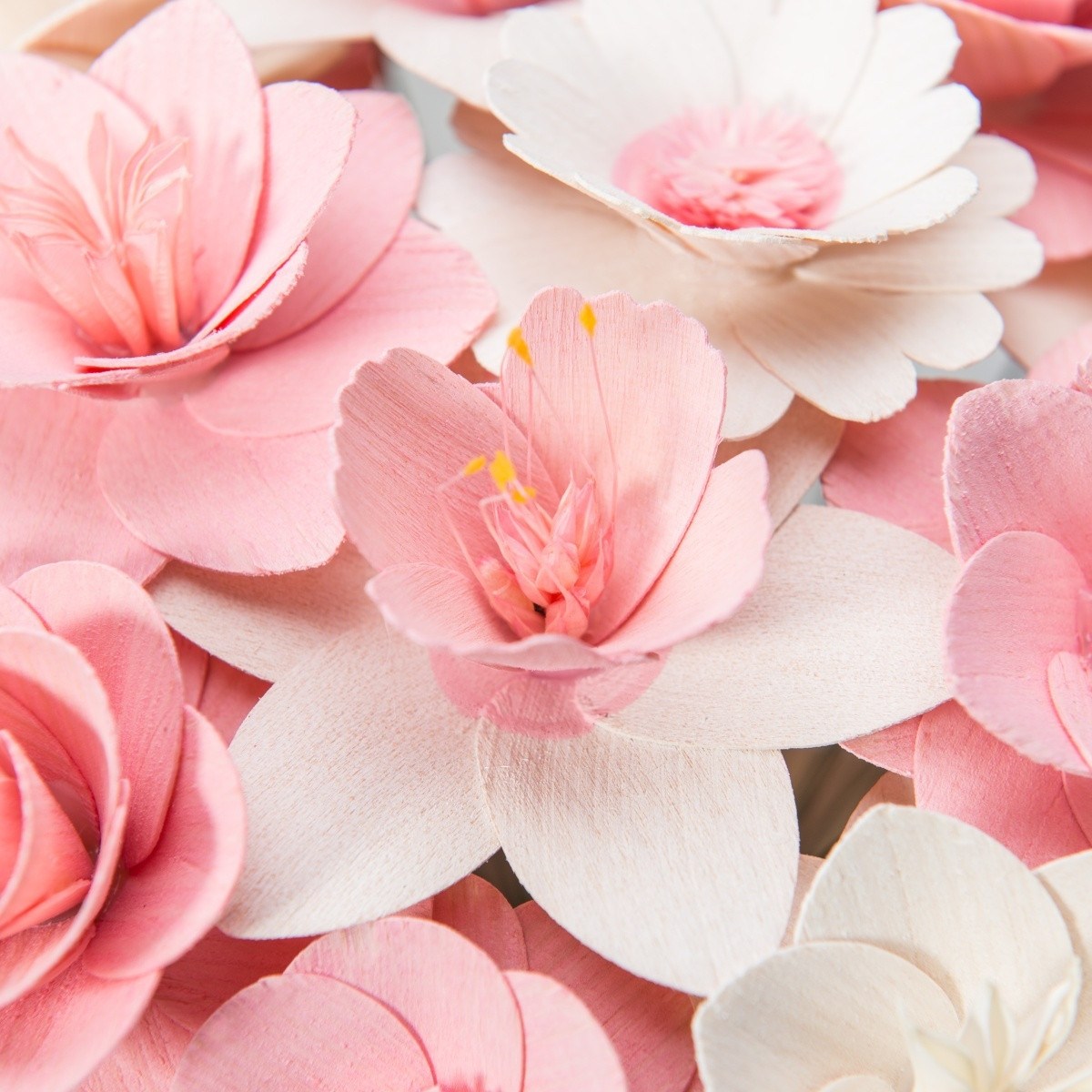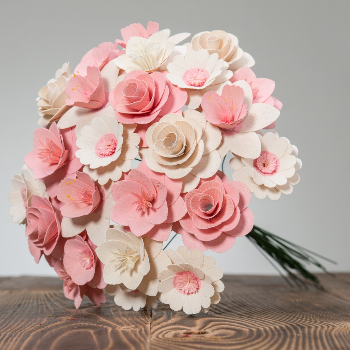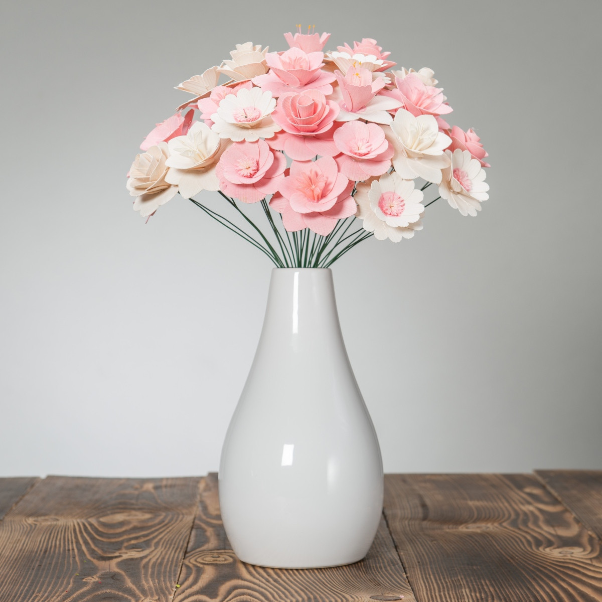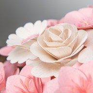 Alle Blumen wurden ausschließlich von Naturmaterialien hergestellt und jede von ihnen ist ein Ergebnis präziser Handarbeit. Nachdem das richtige Holz für die Blätter ausgewählt wurde, muss es handwerklich bearbeitet und gestrichen werden. Die Mitte einiger Blumen besteht sogar aus getrockneten, bemalten Blumenbeeten und aus Pistillen echter Blumen. Sobald alle Komponenten perfekt vorbereitet sind, werden sie von Hand zusammengeklebt und auf einen Drahtstiel gelegt, sodass sie zusammen eine wunderschöne Dekoration jedes Interieurs bilden.