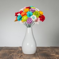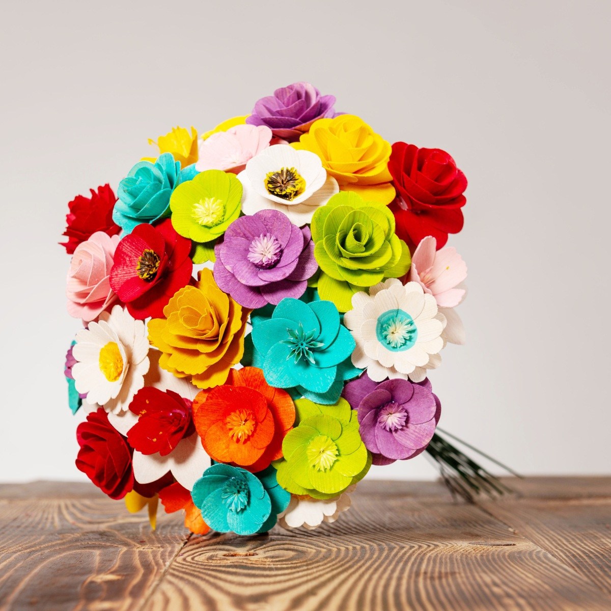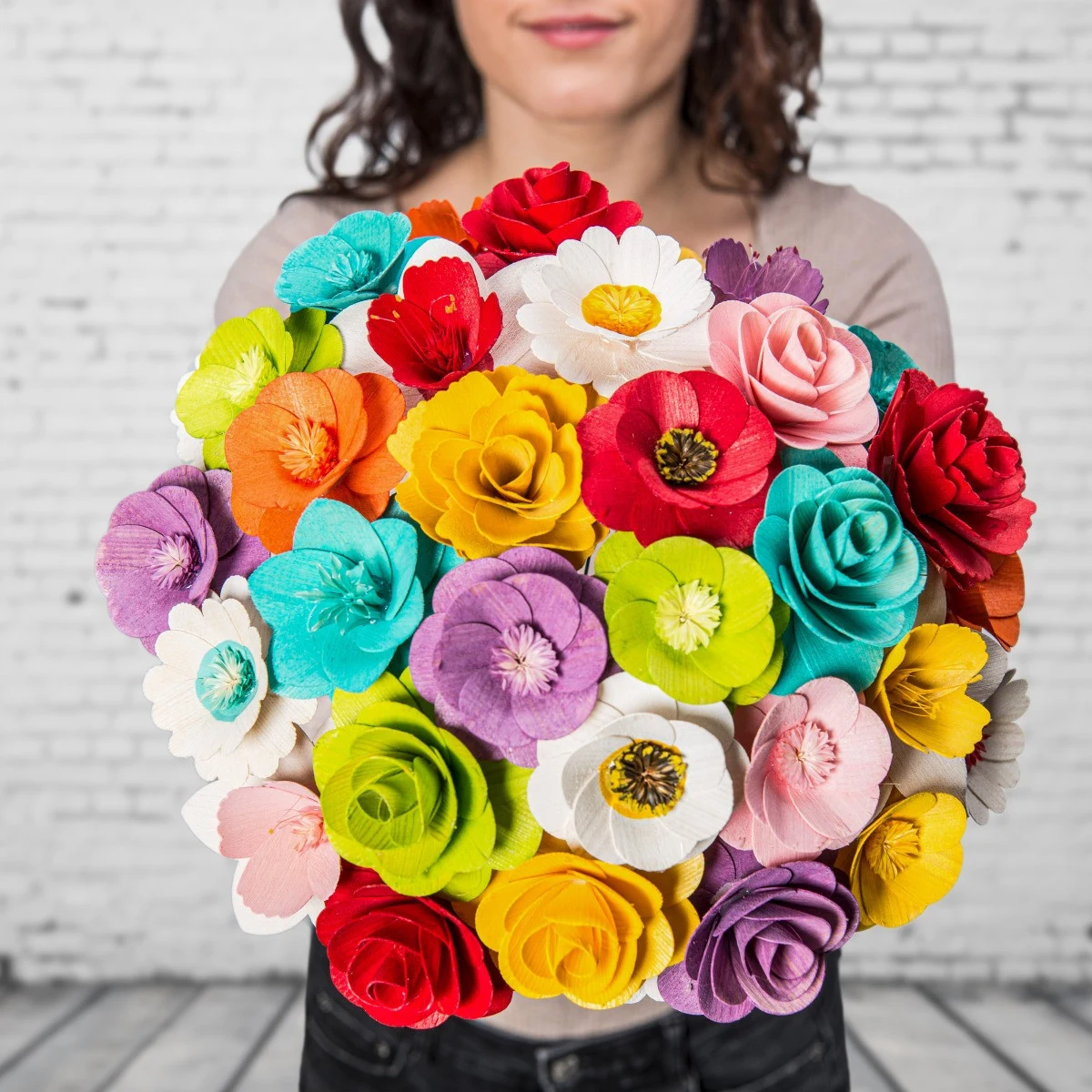 Alle Blumen wurden ausschließlich von Naturmaterialien hergestellt und jede von ihnen ist ein Ergebnis präziser Handarbeit. Nachdem das richtige Holz für die Blätter ausgewählt wurde, muss es handwerklich bearbeitet und gestrichen werden. Die Mitte einiger Blumen besteht sogar aus getrockneten, bemalten Blumenbeeten und aus Pistillen echter Blumen. Sobald alle Komponenten perfekt vorbereitet sind, werden sie von Hand zusammengeklebt und auf einen Drahtstiel gelegt, sodass sie zusammen eine wunderschöne Dekoration jedes Interieurs bilden.
