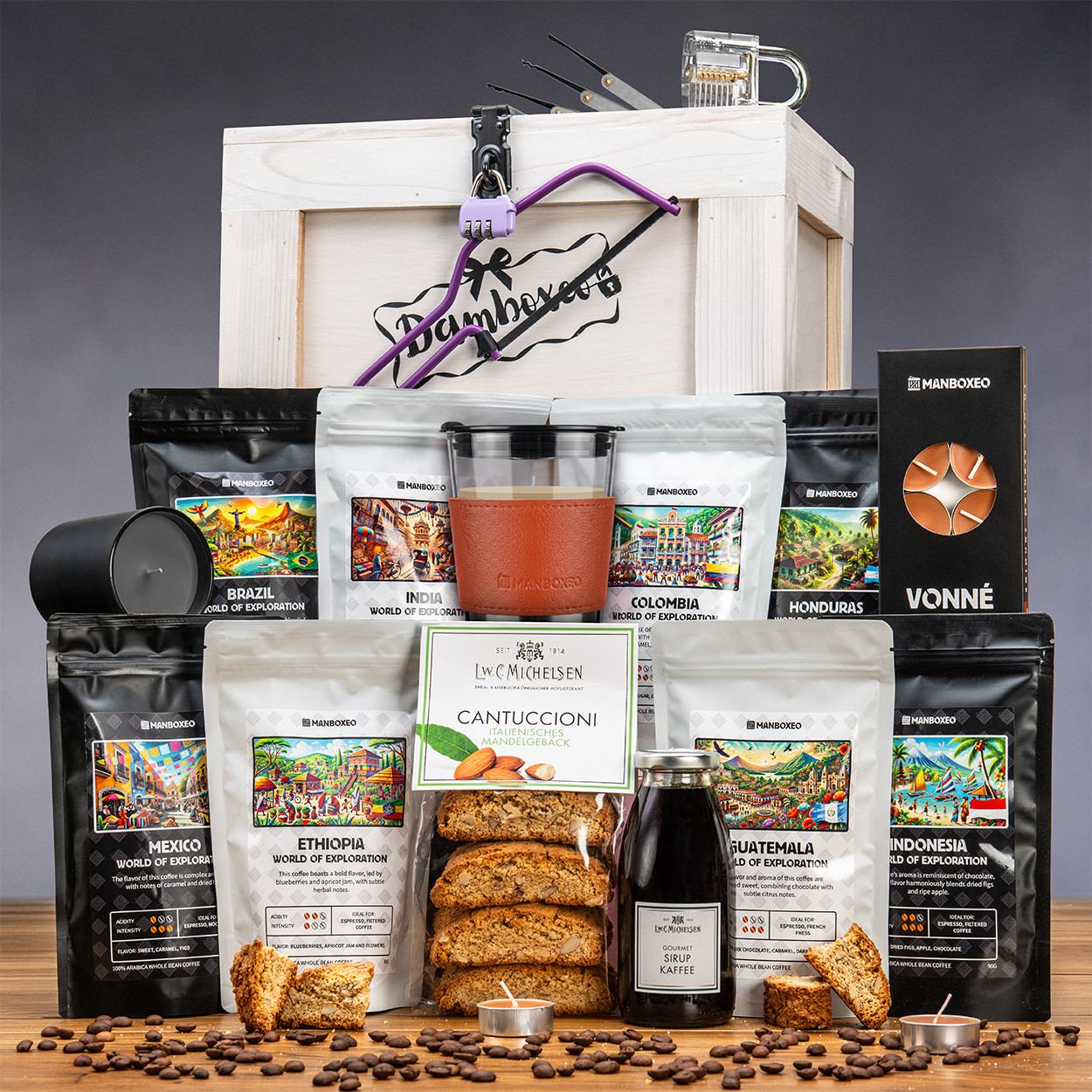 Sind Sie auf der Suche nach einem originellen Geschenk für eine Frau, die leidenschaftlich Kaffee liebt? Wir haben für Sie eine XXL Truhe für Kaffeeliebhaberinnen entworfen, die von jeder Frau geschätzt wird, die nicht ohne Kaffee sein kann. Alle in unserer Geschenktruhe versteckten Kaffeespezialitäten stammen aus Kaffeeplantagen, welche typisch für ihren arabischen Kaffee sind. Damit der Kaffee nicht zu viel wird, finden Sie in der Truhe mit Säge und Schloss auch etwas Süßes was man natürlich mit Kaffee kombinieren kann.