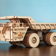 Belaz 75710. Legende unter Lastwagen. Jetzt können Sie ihn zu Hause mit einem 3D Modellsatz aus Holz zusammenbauen! Die Abmessungen werden etwas kleiner sein, aber die Details und die Verarbeitung kopieren treu das Original. Darüber hinaus verfügt es über mehrere bewegliche Teile, die es zu einem einzigartigen Holzbausatz machen. Müssen Sie Fracht holen? Einfach zurückziehen! Die Räder drehen sich mit Hilfe von einem Schwungrad. Sind Sie neugierig, was er unter der Haube hat? Kein Problem! Der Hebel vorne zeigt den perfekten Motor. Es fehlt auch eine voll funktionsfähige Ladefläche nicht, die durch das Drücken des mit dem Gummimechanismus verbundenen Hebels angehoben werden kann.
