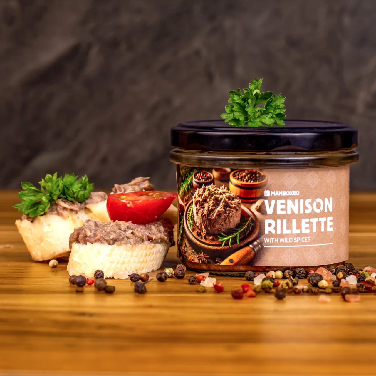 Hirsch-Rillette mit Wildkräutern 170 g – Mr.HomeMade - Dieser Fleischaufstrich gehört zu den echten Spezialitäten. Das Hirschfleisch wird in Schweinefett konfiert, bis es komplett auseinanderfällt. Das Ergebnis ist ein ungewöhnlich delikater und reicher Geschmack, der durch eine Mischung aus Wacholder und Lorbeerblättern verstärkt wird. Am besten schmeckt er als Aufstrich auf einer frischen, knusprigen Scheibe Brot oder Kräuterbaguette.