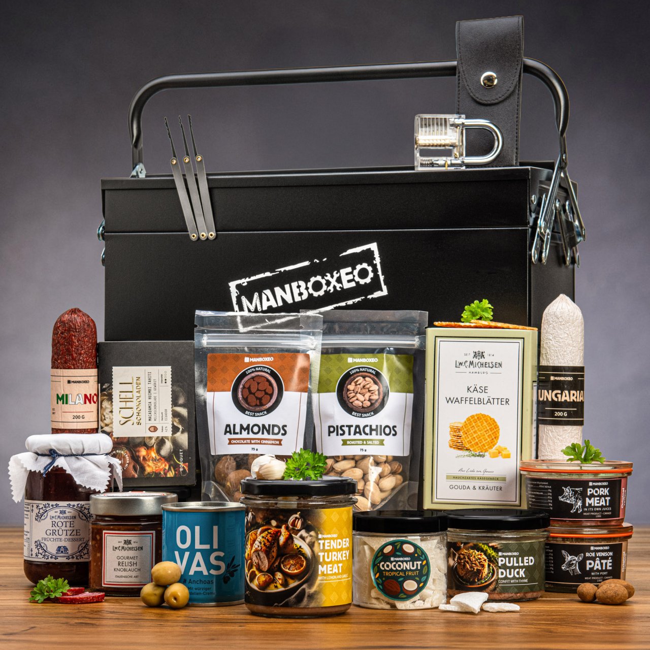 Mysleli jste si, že kovová plechovka obsahuje jen nářadí? Zamyslete se znovu, dámy a pánové. Kdokoli, kdo tento skvost získá, čeká opravdová gurmánská lahůdka. Uvnitř nalezne výběr vysoce kvalitních masových lahůdek doplněných sladkými i slanými dobrotami – potěšení pro znalce dobrého jídla. Perfektní dárek pro ty, kteří si v životě cení těch lepších věcí!
